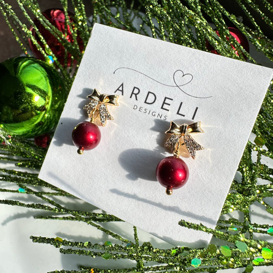Holiday Cheer Gold Plated Bow Post with Red Pearl Dangle Earrings