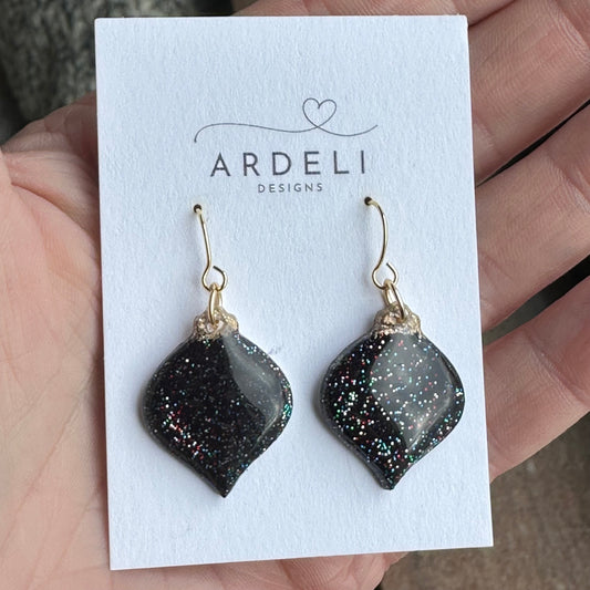 “Betty” Black Sparkle Ornament w/Gold Plated Hook Dangle Earrings