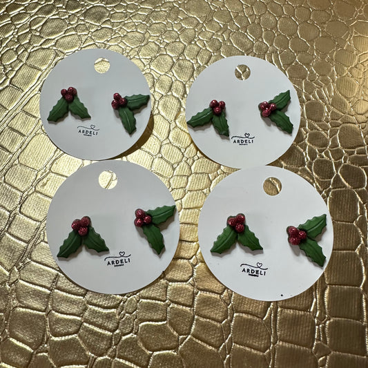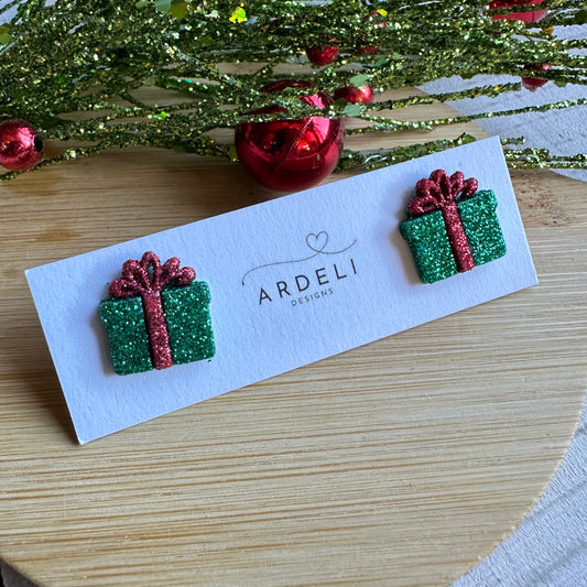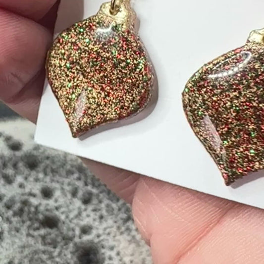 “Betty” Gold, Red, Green Glitter Ornament w/Gold Played Hook Dangle Earrings