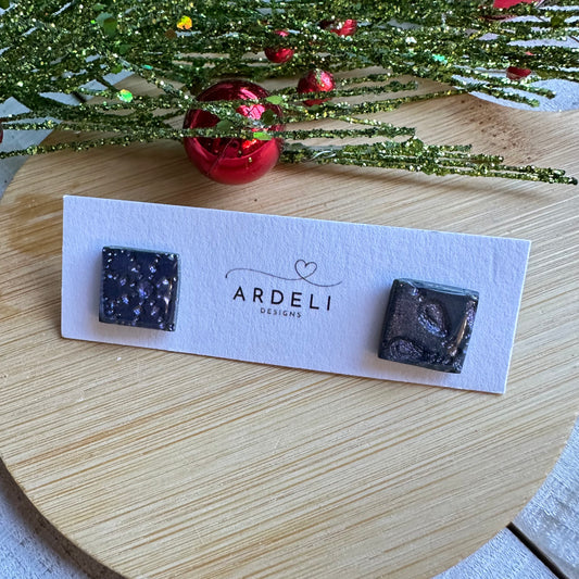 Handmade Polymer Clay Blue Purple Shimmer Embossed Snowflake Square Earring Studs