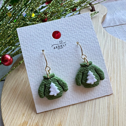 Handmade Polymer Clay Green Ugly Sweater Gold Hook Dangle Earrings