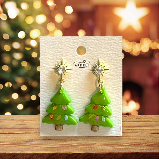 Handmade Polymer Clay Lights On Christmas Tree Gold Plated CZ Post Dangle Earrings